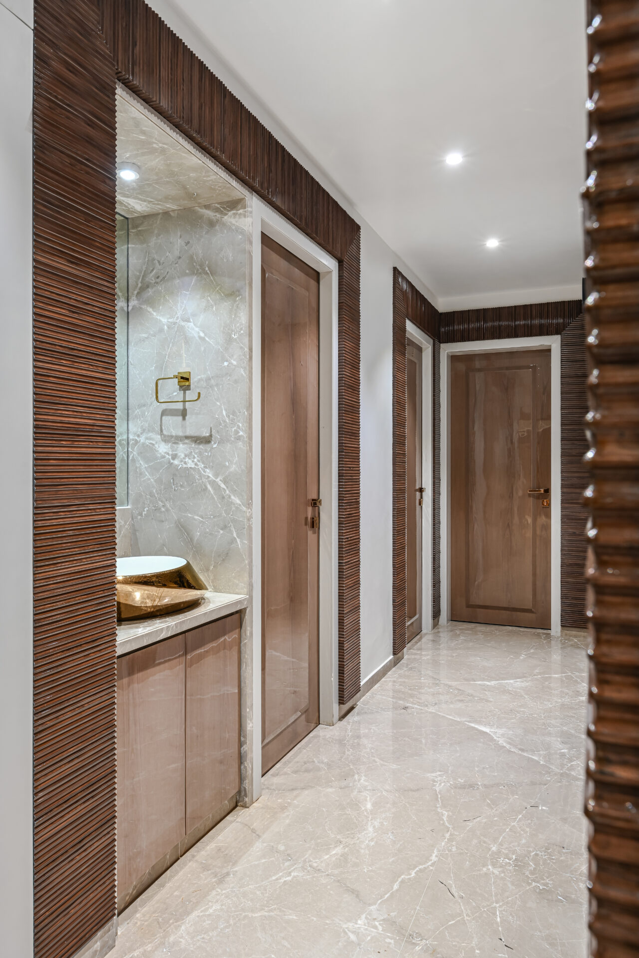 The dining area is crafted as a fluid continuation of the living space, preserving the diverse theme while introducing an artistic contrast. A mandir near the dining table contributes sculptural appeal. Corian complements the marble finishes utilized throughout the home. The design emphasizes: Visual coherence A well-balanced material selection High-quality surface treatments An elegant yet practical layout Each element is purposefully positioned to foster a harmonious dining experience within this luxurious 3 BHK interior design in Ghatkopar